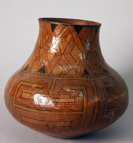 Olla in terracotta con largo ventre e orlo dritto. L'esterno del vaso è dipinto a motivi geometrici con pigmento rosso e nero su fondo color ocra. Il collo è ricoperto di linee a zig zag che si intersecano, bordate di nero con 4 linee rosse interne (motivo kujape'i, piccolo piatto in guscio di Crescentia cuiete). Il ventre presenta il motivo della stilizzazione antropomorfa (taygawa pyka o taygawa seduto).