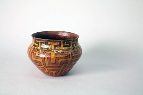 Vaso in terracotta con orlo leggermente estroflesso. La superficie è decorata a motivi geometrici con pigmento rosso e nero su fondo color ocra. Si tratta del motivo della stilizzazione antropomorfa ( taigawa) sul collo e sul ventre del vaso, rispettivamente con tratti neri e con tratti di colore rosso bordati di nero. L'esterno è verniciato con resina.