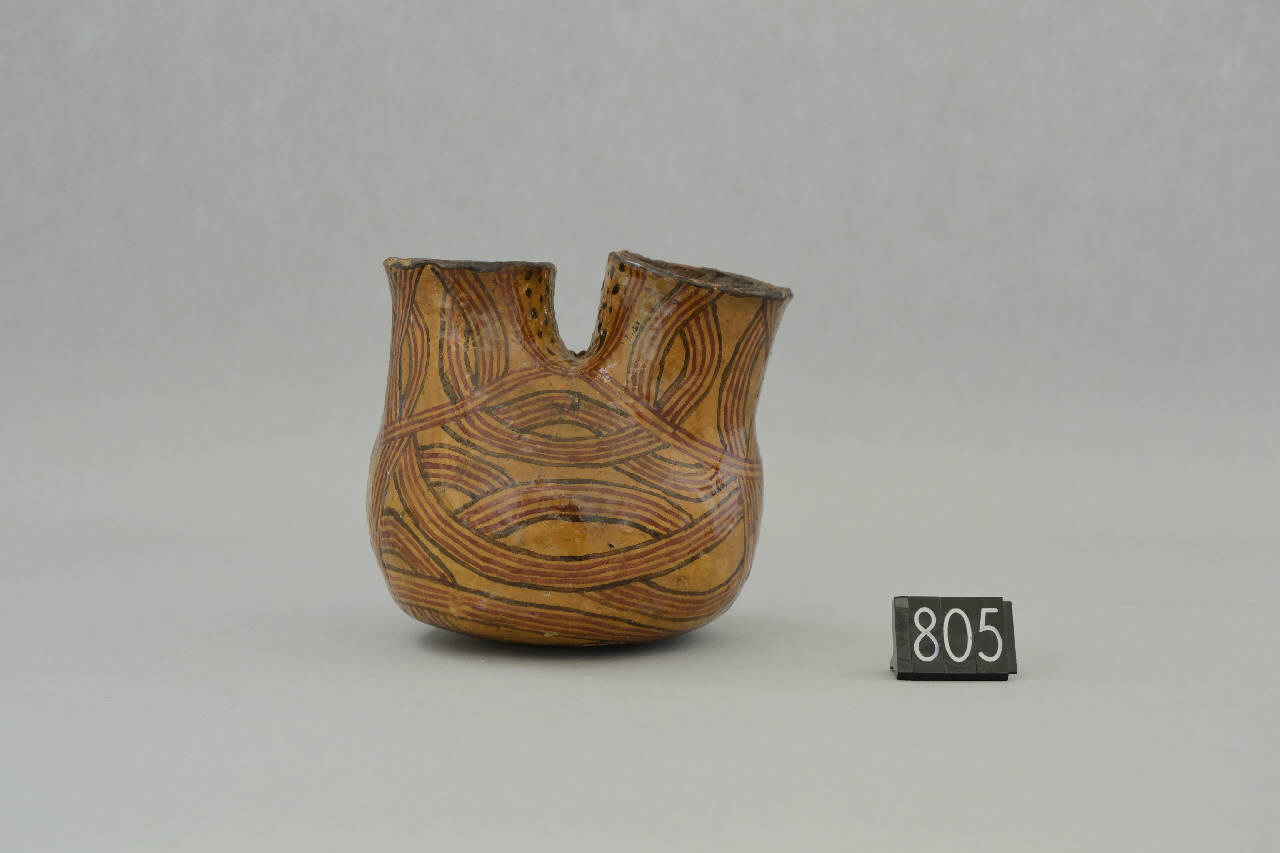 Olla in terracotta con collo doppio dipinta in bicromia su fondo color ocra e verniciata con resina vegetale. La decorazione è costituita da un motivo geometrico a volute. Le volute hanno il perimetro nero e tre linee rosse interne (kumanà, fagiolo). Tra i due colli sono presenti motivi puntiformi neri (pinima, striscia o zona di puntini).