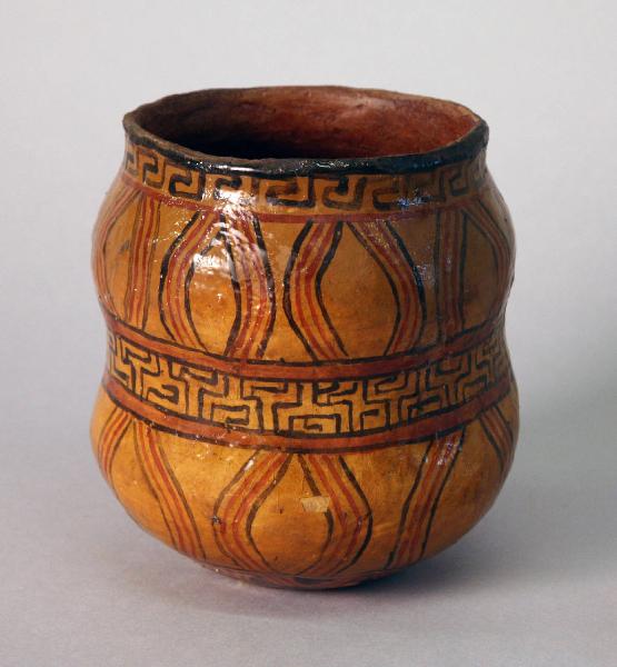 Vaso allungato in terracotta con leggera strozzatura centrale e orlo dritto decorato a greche nere su fondo ocra rifinito con pittura nera. La superficie esterna del vaso è decorata da motivi geometrici bicromi su fondo color ocra divisi sul restringimento stesso da un motivo nero a doppie greche delimitato da una fascia rossa superiore e una inferiore. La decorazione, che si ripete identitica al di sopra ed al di sotto della strozzatura centrale, è costituita da un motivo a ogive bordato di nero con tre linee rosse interne (kumanà- fagiolo). L'esterno del vaso é verniciato con resina vegetale.