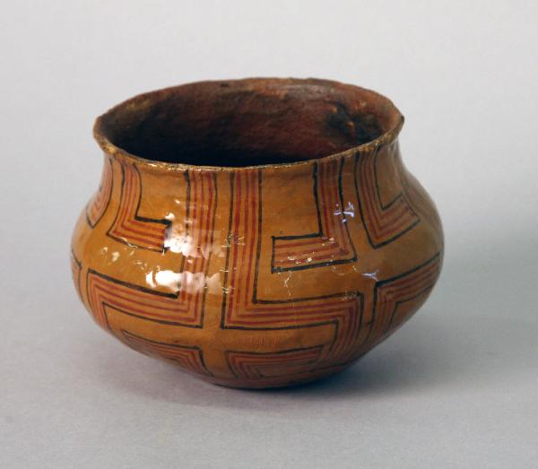 Olla in terracotta, con collo largo e orlo estroflesso . L'esterno del vaso è decorato con motivi geometrici bicromi su fondo color ocra su tutta la superficie. Si tratta di un motivo tipo greca costituito da una linea perimetrale nera al cui interno ci sono tre linee rosse (jautipapera, mano di Testudo tabulata). Il vaso è verniciato con resina naturale.