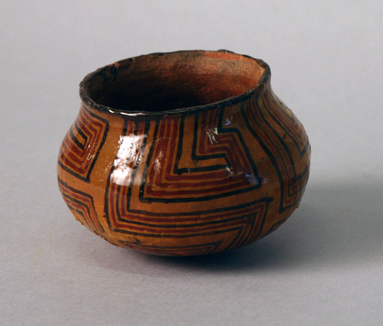 Olla in terracotta, con orlo leggermente estroflesso e rifinito con pigmento nero. L'esterno del vaso è decorato con motivi geometrici biscromi su fondo color ocra su tutta la superficie. Si tratta di un motivo tipo greca costituito da una linea perimetrale nera al cui interno ci sono tre linee rosse (taygawa, la stilizzazione antropomorfa). La superficie del vaso è verniciata con resina naturale.