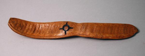 Sonaglio realizzato con un grande baccello essiccato che presenta decorazioni geometriche incise su entrambe i lati con probabile valore simbolico: una centrale su un lato è costituita da due cerchi con 4 raggi perpendicolari alla circonferenza e due sull'altro lato alle due stremità sono costituite rispettivamente dal precedente motivo e da un cerchio con un peduncolo. Una delle estremità presenta un piccolo foro passante per la sospensione.