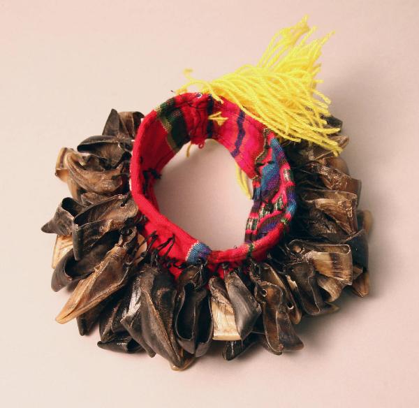 Sonaglio da braccio realizzato da una fascia di stoffa policroma che funge da supporto per l'applicazione di quattro file di sessanta elementi ciascuno di zoccoli. Oltre ai pendenti, al supporto sono cuciti dei fili di cotone di colore giallo.