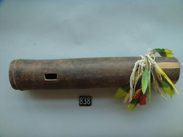 Flauto da richiamo realizzato intagliando e forando una canna di bambù. All'estremità inferiore dello strumento sono appese con un filo di cotone otto penne verdi, una gialla e una rossa.
