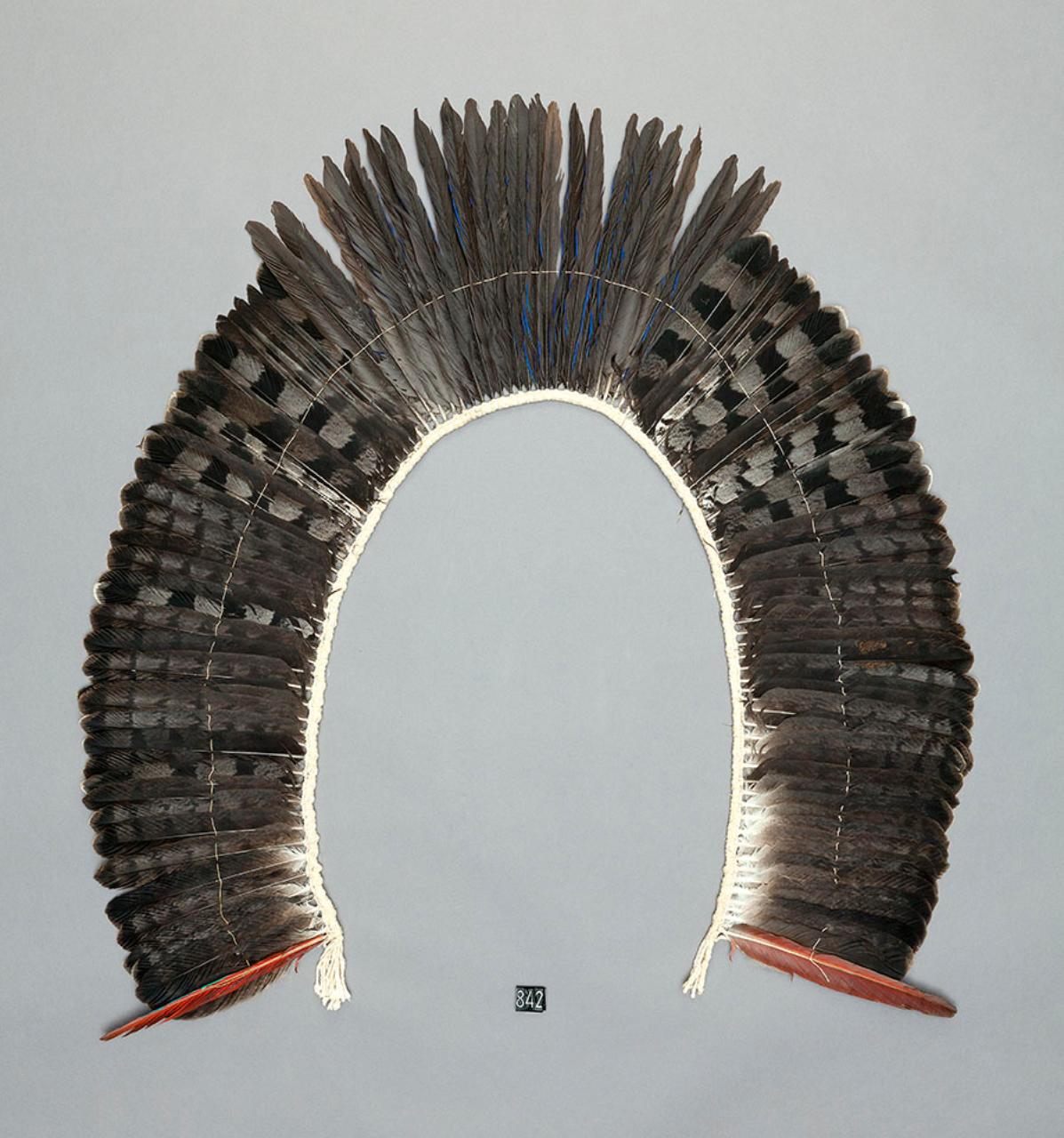 Diadema occipitale a ruota per la testa di cotone e penne. Le 113 penne, fissate ad un supporto di cotone intrecciato a creare una corda che tiene insieme numerose altre cordicelle, sono disposte in un'unica fila e presentano tre diversi colori: 2 azzurre con il retro rosso, 23 blu con il retro marrone e 88 striate bianche e marrone con il retro marrone. Sono disposte nel seguente modo: da destra 1 azzurra, 47 striate, le 23 blu, 41 striate e 1 azzurra. A circa 10 cm dal supporto c'è un'altra cordicella che tiene unite le penne.