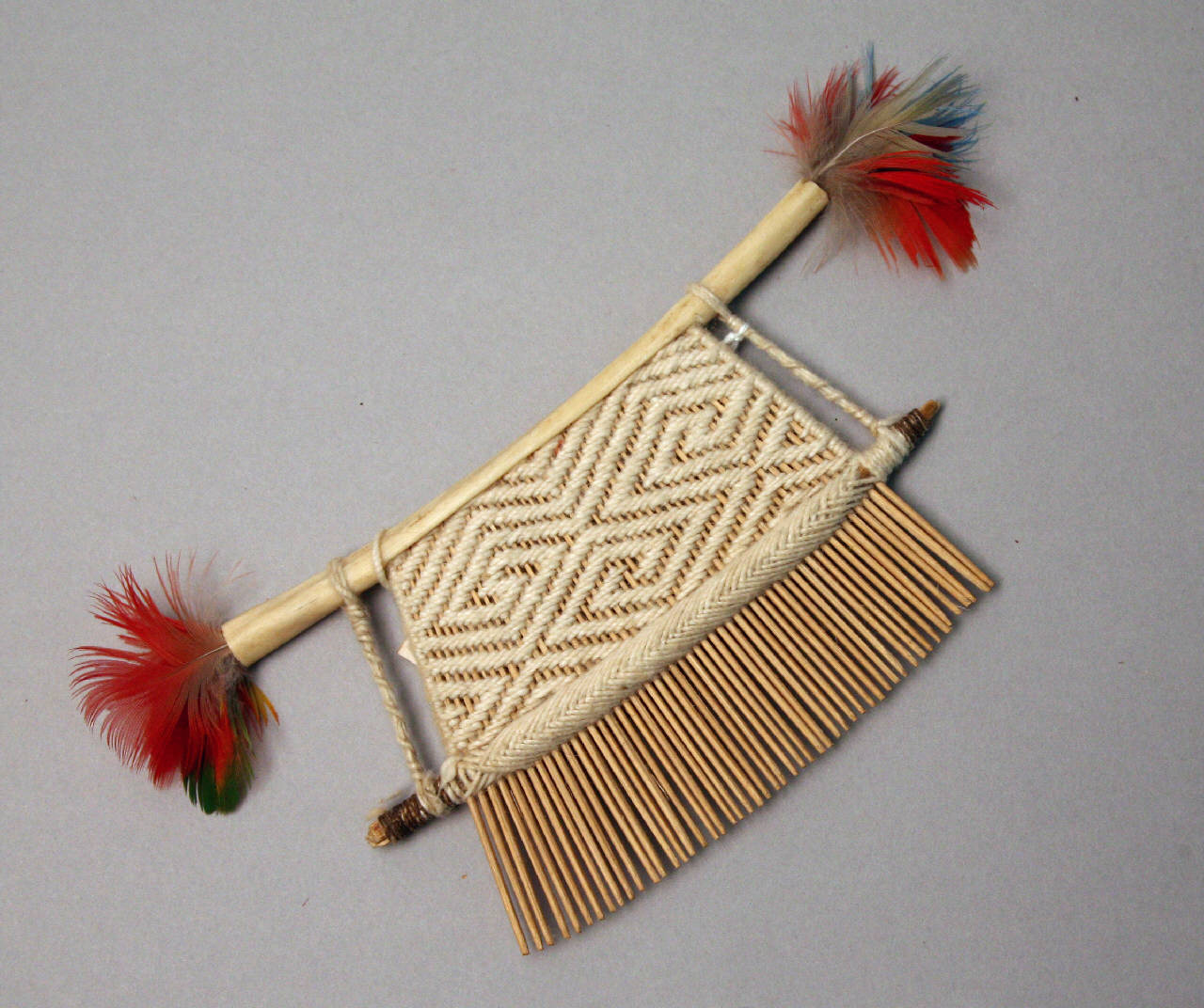 Pettine di legno e osso, con i denti fissati a due supporti, quello di legno avvolto in filo di cotone bianco e quello d'osso con piume rosse applicate alle estremità. Tra i due supporti un intreccio in filo di cotone rettangolare presenta un disegno a volute.