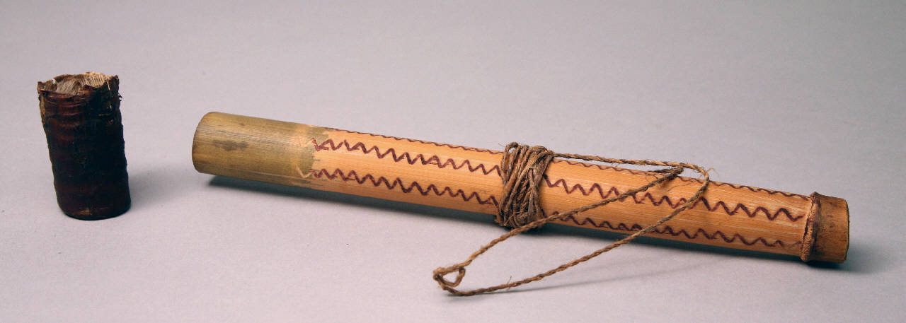 Astuccio in canna, chiuso sul fondo con pelle e sull'estremità superiore con corteccia. E' decorato con linee ondulate pirografate.