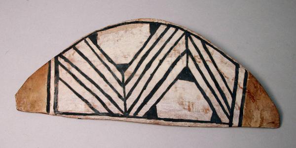 Spatola lignea di forma semicircolare, dipinta sulle due facce. Le decorazioni sono a motivi geometrici simbolici realizzati con pigmento nero su sfondo bianco.