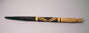 Bastone realizzato in un unico pezzo di legno, con la punta indurita tramite esposizione al fuoco e dipinta di nero. L'impugnatura è scolpita e la parte centrale è decorata con pigmento nero a motivi geometrici romboidali.