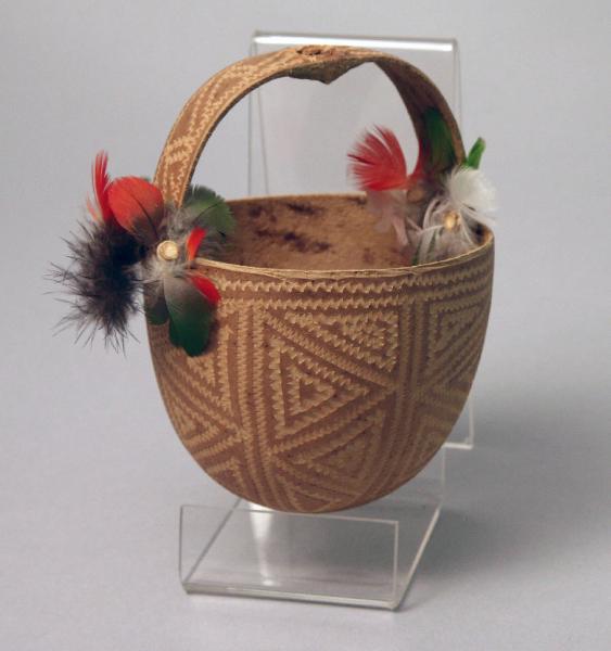 Cesto di zucca con manico ad anello. E' decorato su tutta la superficie con incisioni geometriche e con due nappe di piume rosse, bianche e verdi legate con filo di cotone naturale.