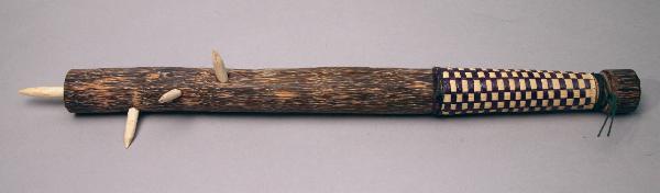 Clava in legno a sezione circolare con tre zanne fissate nella estremità superiore e una sulla punta. Il manico è rivestito di fibra vegetale di colore chiaro e di colore bruno intrecciata in modo da realizzate un disegno a scacchiera: arma da difesa