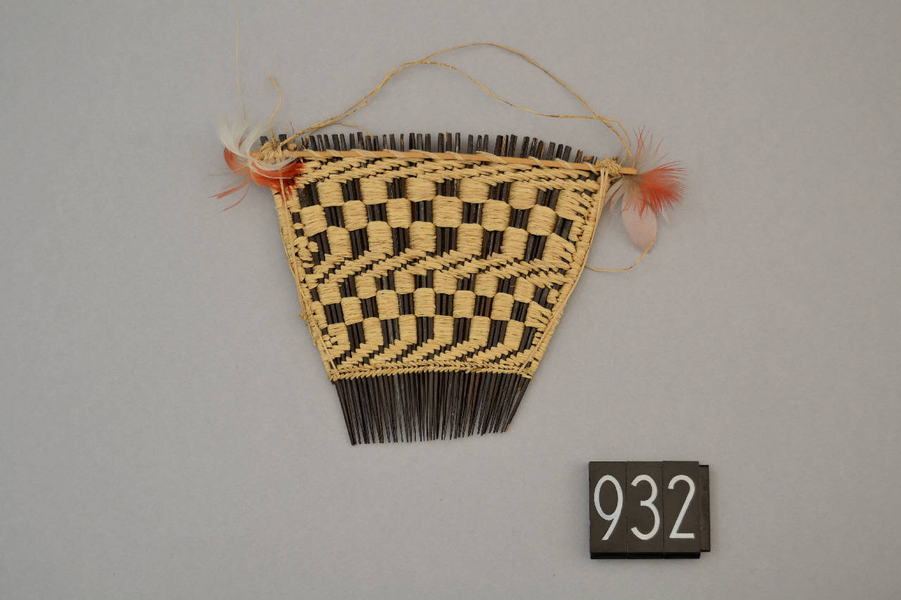 Pettine quadrangolare con denti in legno tenuti insieme da filo di cotone intrecciato che forma un disegno a scacchiera. Piume rosse e bianche sono fissate ai due angoli superiori.Reca cordicella di sospensione in fibra vegetale.