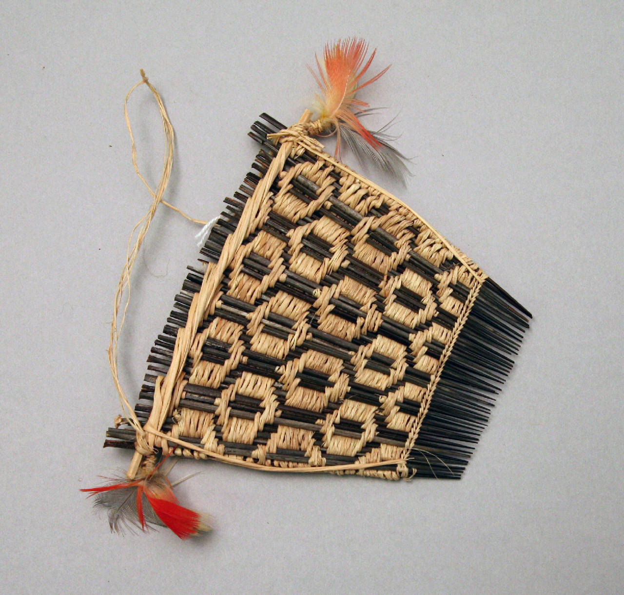 Pettine quadrangolare con denti in legno tenuti insieme da filo di cotone intrecciato che forma un disegno a esagoni. Piume rosse e bianche sono fissate ai due angoli superiori. Reca cordicella di sospensione in fibra vegetale.