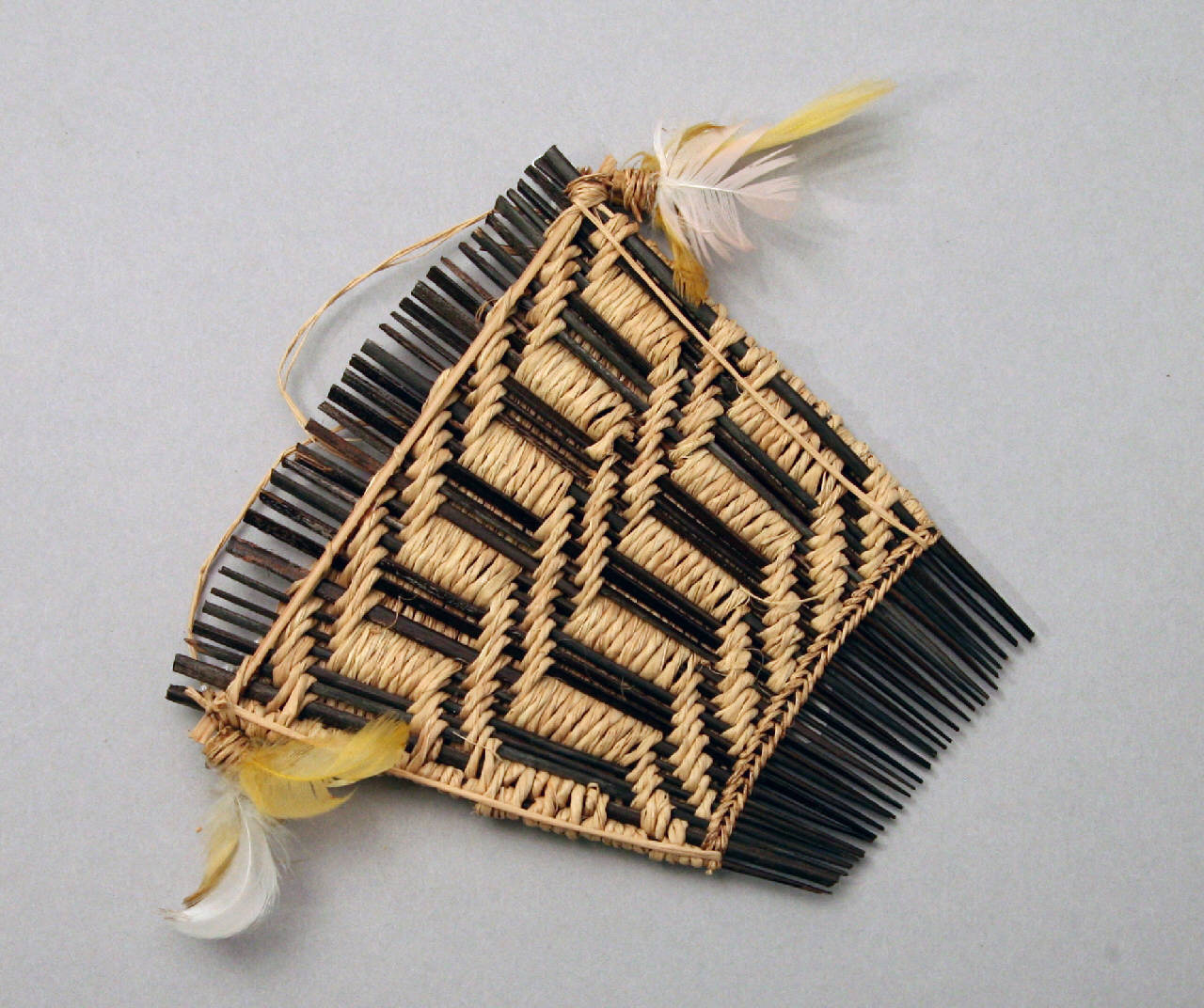 Pettine quadrangolare con denti in legno tenuti insieme da filo di cotone intrecciato che forma un disegno a linee ondulate. Piume bianche e rosse sono fissate ai due angoli superiori. Reca cordicella di sospensione in fibra vegetale.