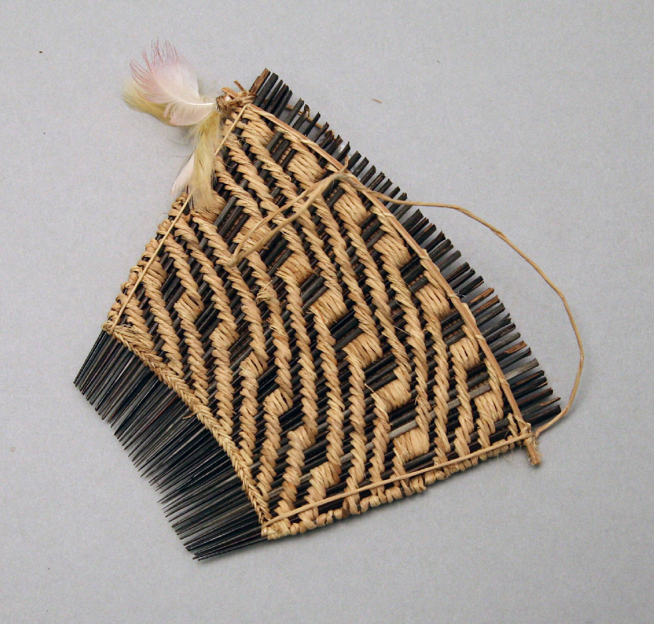 Pettine quadrangolare con denti in legno tenuti insieme da filo di cotone intrecciato che forma un disegno a rombi. Piume gialle e rosa sono fissate ad uno dei due angoli superiori. Reca cordicella di sospensione in fibra vegetale.