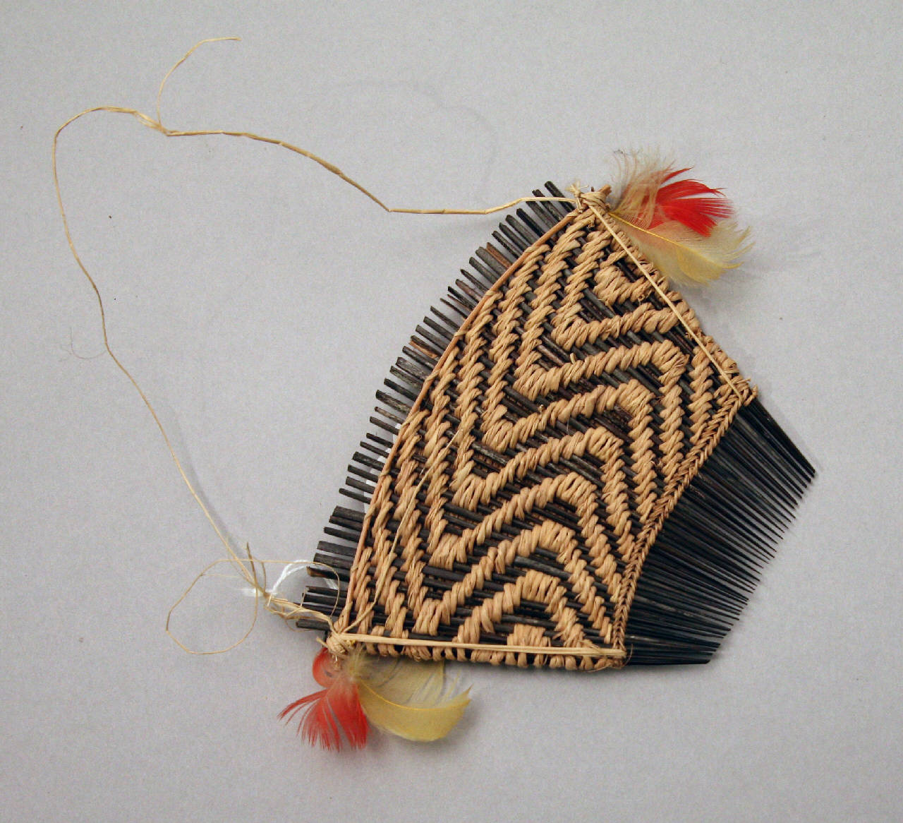 Pettine quadrangolare con denti in legno tenuti insieme da filo di cotone intrecciato che forma un disegno a linee ondulate. Piume rosse e gialle sono fissate ai due angoli superiori. Reca cordicella di sospensione in fibra vegetale.