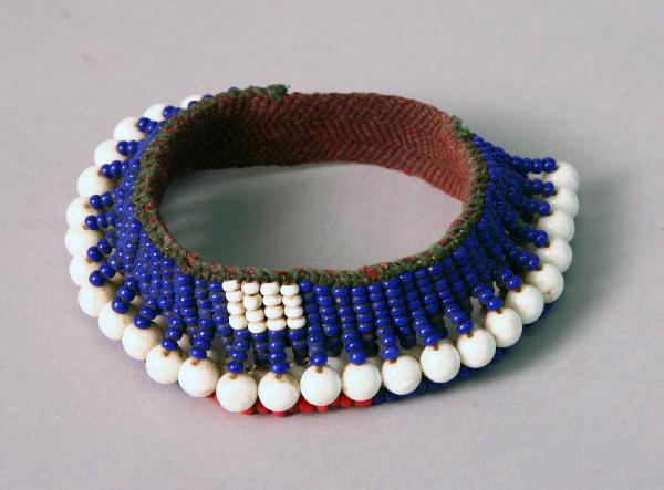 Ornamento brachiale composto da un anello di cotone a cui sono cucite perline in plastica di colore blu, bianco e rosso. Le perle blu formano una fascia, di cinque file, interrotta da una quadrato di piccole perline bianche, sotto al quale ci sono due fasce, una interna e una esterna di pendenti. Ciascun pendente di quella esterna è composto da tre perline blu e una bianca grande, mentre ogni pendente di quella interna è composta da tre blu e una bianca media. I due pendenti sono riuniti da un'ultima fila, che presenta per metà perline rosse e per metà perline blu.