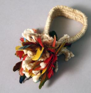 Ornamento brachiale composto da una fascia di cotone grezzo chiuso ad anello ed a cui sono cucite ciuffi di piume multicolori, verdi, gialle, rosse e marroni.