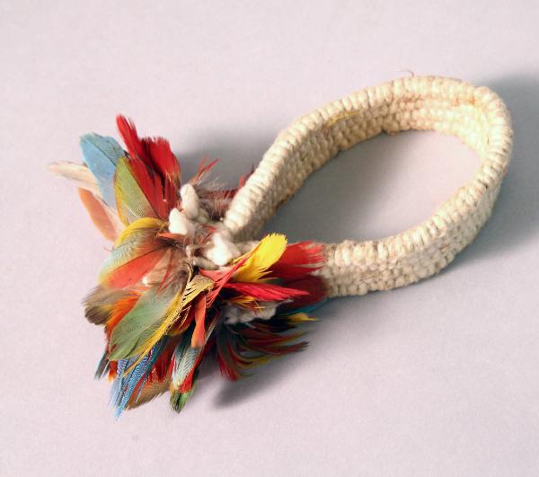 Ornamento brachiale composto da una fascia di cotone chiuso ad anello a cui sono cucite delle piume multicolore verdi, gialle, rosse e marroni.