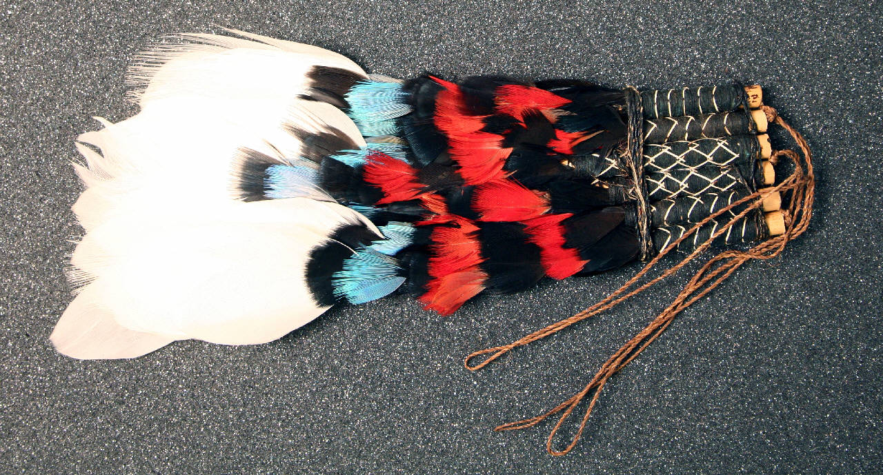 Ornamento dorsale di piume costituito da 6 tubicini di canna che nella metà superiore sono avvolti da filo di cotone nero e in quella inferiore sono ricoperti, nella parte terminale, da pendenti di piume di colore bianco e nella parte centrale da piume tagliate di colore nero alternate rispettivamente a piume rosse e piume azzurre. Il filo di cotone nero è attraversato da un filo più chiaro che crea motivi geometrici sulle canne (a rombi nelle due centrali e con linee orizzontali nelle rimanenti).