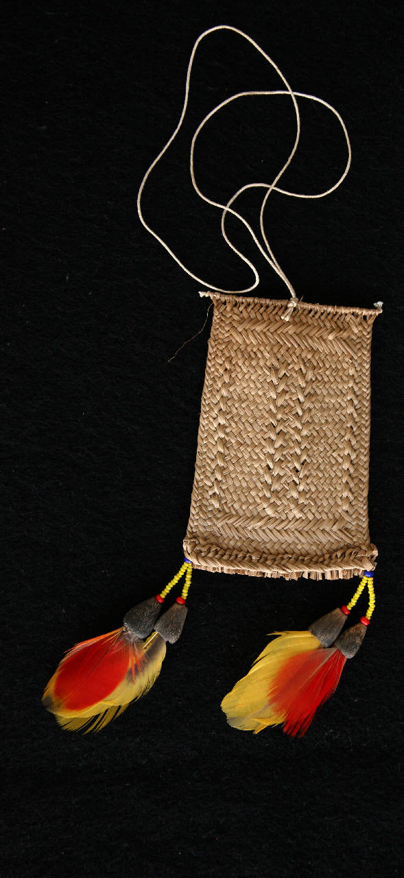 Ornamento per il collo con pendente in fibra vegetale e piume. Il pendente è composto da una rettangolo di fibra intrecciata a spina di pesce. L'intreccio forma al centro un rettangolo attraversato da due linee verticali, il tutto in rilievo. Ai due angoli inferiori sono cuciti quattro pendenti, due per angolo, formati ciascuno da una perlina rossa, un mezzo seme nero e una piuma. Per ciascuna coppia le piume sono una gialla e una rossa.