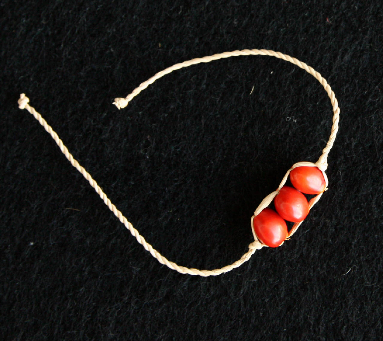 Bracciale di cotone e semi. Al centro di un filo ritorto di cotone naturale sono legati tre semi rossi forati.