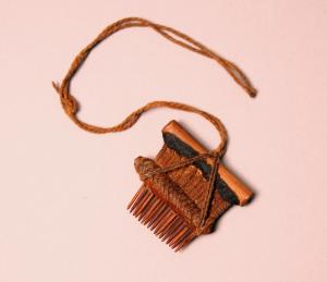 Collana in cotone con un piccolo pettine ligneo come pendente. Il pettine è quadrangolare con impugnatura costituita da bastoncino ligneo a cui è fissata una struttura di fibra avvolta da filo di cotone intrecciato. Sottili asticelle appuntite di legno sono fermate da una spoletta, a sua volta, avvolta da filo di cotone intrecciato a spina di pesce. Una cordicella in fibra funge da sospensione.