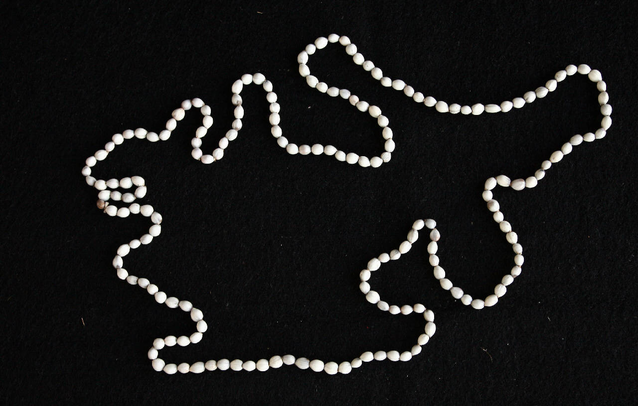 Collana di semi a un solo giro. Su tutta la lunghezza sono infilati i semi, piccoli e di colore chiaro, fra bianco e grigio.