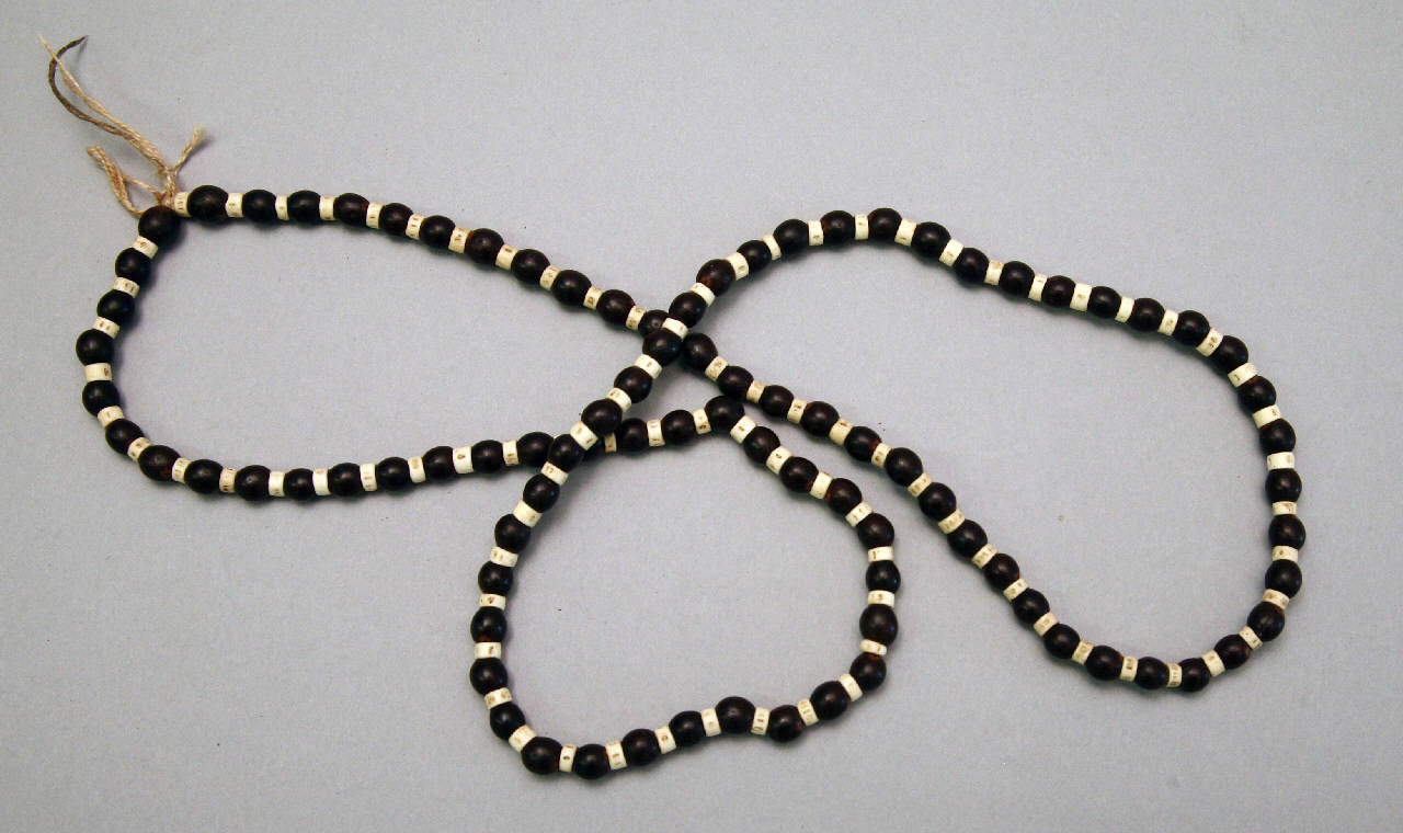 Collana di semi e osso a un giro. Su tutta la lunghezza sono infilati piccoli semi neri e ossio alternati uno a uno. Gli ossi sono probabilmente vertebre o di pesce o di rettile.