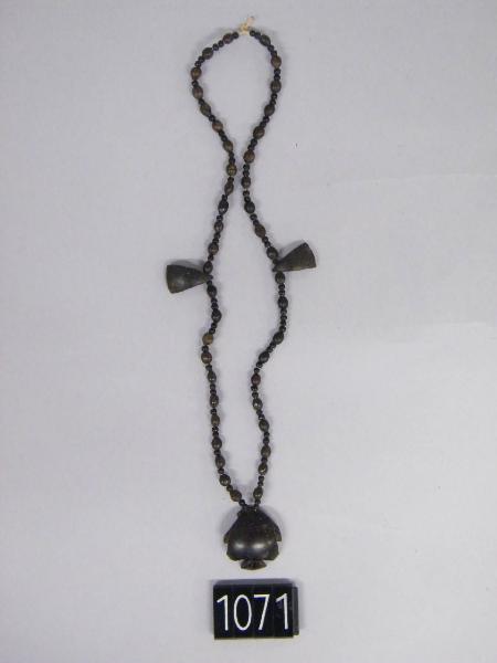 Collana di semi a un giro con pendente zoomorfo. Su tutta la lunghezza sono infilati piccoli semi neri alternati uno a uno a semi neri di aggiore grandezza. Nel giro sono inseriti anche due triangoli in legno di cocco equidistanti dalla chiusura. Il pendente è in guscio di noce di cocco lavorato a intaglio e raffigura un pesce.