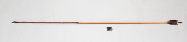 Freccia con asta di bambù, punta in legno e ferro e paletta con due penne gialle e una bianca. La punta è composta da un'asta d'innesto di legno e una piccola punta in ferro. L'incocco è coperto di resina.