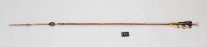 Freccia con asta di bambù, punta in legno e paletta con una penna nera. Alla base della punta è inserito un seme.