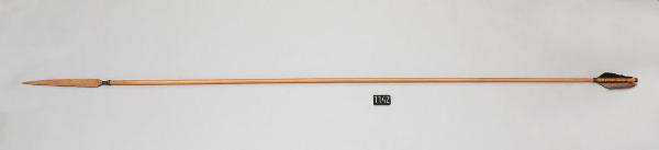 Freccia con asta di bambù, punta in bambù piatta e paletta con una penna nera.