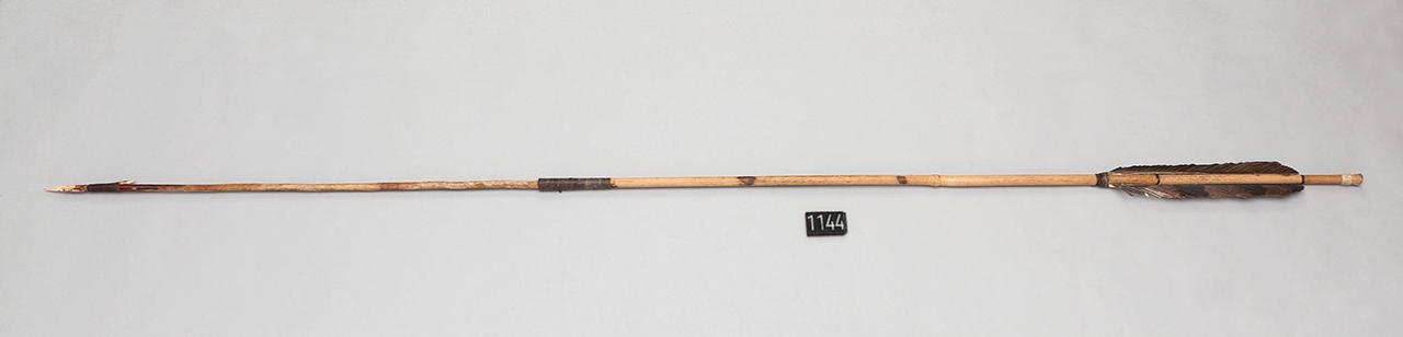 Freccia con asta di bambù, punta in legno e osso e paletta con una penna metà nera e metà grigia striata di nero. La punta è composta da un'asta d'innesto di legno e punta doppia in osso legata con filo.