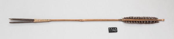 Freccia con asta di bambù, punta in legno multipla e paletta con una penna nera . La punta è composta da quattro aste di legno appuntite. Date le dimensione è probabilmente un'arma da bambino.