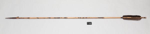 Freccia con asta di bambù, punta in ferro e paletta con una penna nera. La punta è doppia e seghettata .