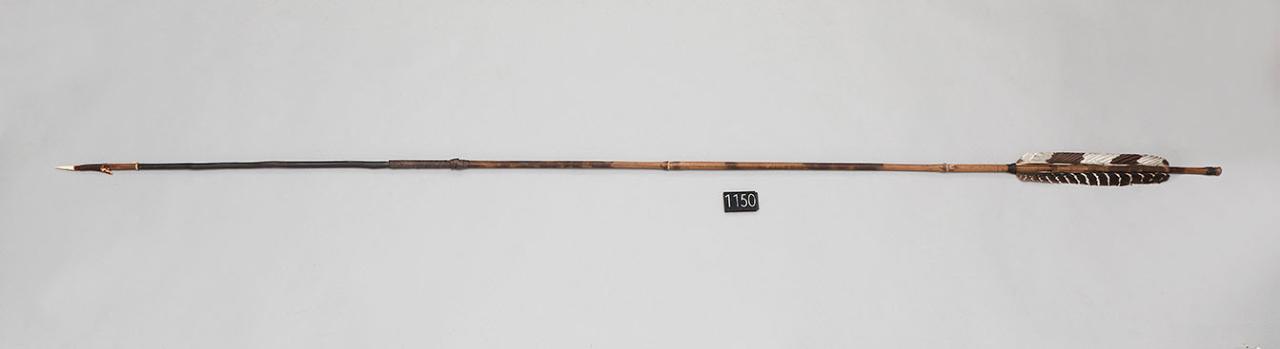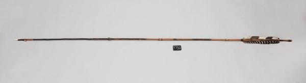 Freccia da bambino con asta di bambù, punta in legno e osso e paletta con mezza penna marrone con striature bianche e mezza bianca e marrone a strisce larghe . La punta è composta da un'asta in legno e una punta doppia in osso .