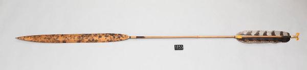 Freccia con asta in canna, punta in canna piatta e paletta con una penna nera e bianca a strisce larghe e delle piume gialle legate alle estremità.