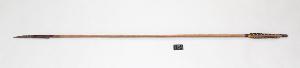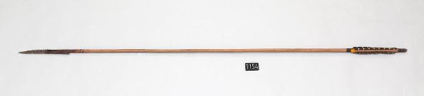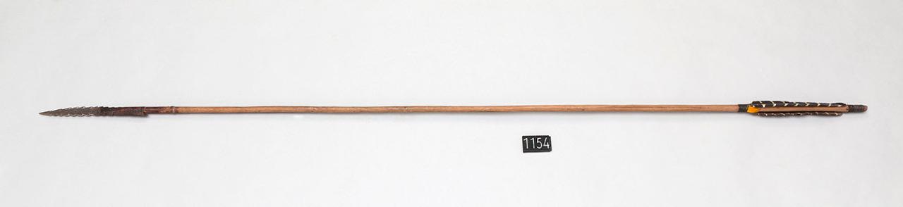Freccia con asta in canna, punta in ferro seghettata doppia e paletta con una penna marrone e bianca e delle piume gialle legate alle estremità.