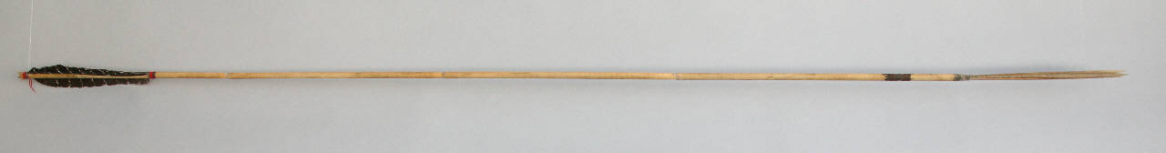 Freccia con asta in canna, punta triplice in canna e paletta con una penna nera.