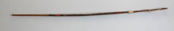 Arco in legno con corda in fibra vegetale. Il legno é rivestito con strisce in fibra vegetale in quattro punti delle quali sono fissate delle piumette rosse. Sul legno è avvolta anche una seconda corda.