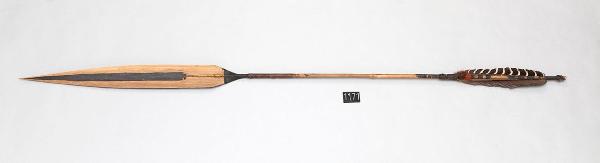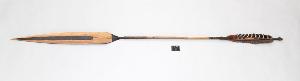Freccia con punta e asta in canna. La penna è di colore scuro con striature bianche. L'estremità dell'asta più vicina alla penna è decorata con motivi pirografati. La decorazione è composta da sei fasce , divise in due gruppi da tre. La punta é tinta di nero per la presenza di curaro.