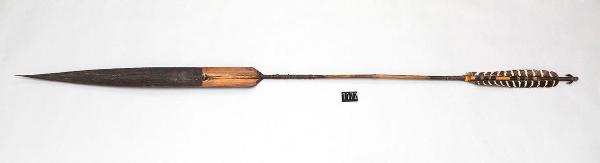 Freccia con punta e asta in canna. La penna è di colore scuro con striature chiare. L'estremità dell'asta più vicina alla penna è decorata con motivi pirografati. La decorazione è composta da otto fasce, due più larghe agli estremi e in mezzo sei più sottili divise in due gruppi da tre. La punta sul retro é tinta di nero con il curaro, mentre sul davanti il curaro crea tre gruppi di tre linee orizzontali.