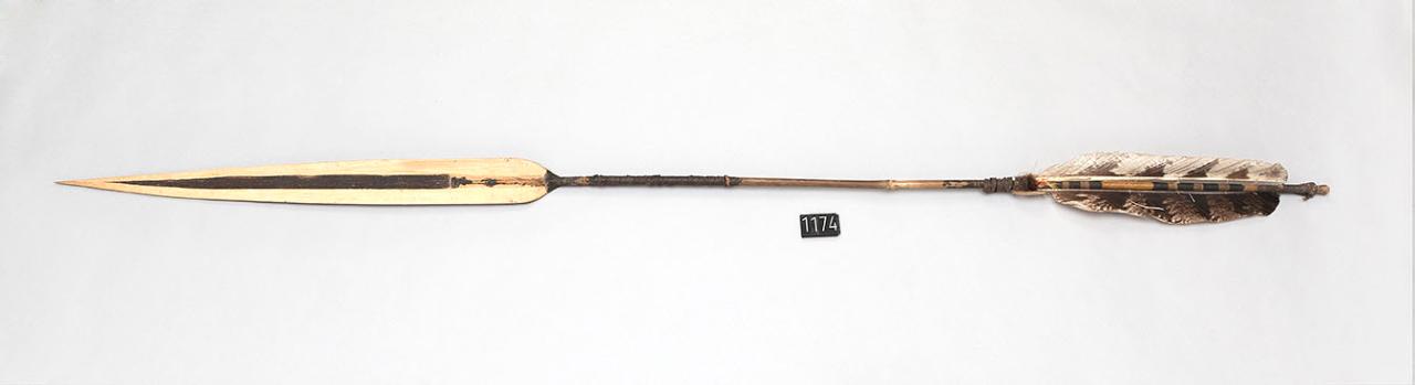 Freccia con punta e asta in canna. La penna è di colore marrone chiaro con striature scure. L'estremità dell'asta più vicina alla penna è decorata con motivi pirografati. La decorazione è composta da sei fasce, divise in tre gruppi da due. La punta é tinta di nero con il curaro sul retro, mentre il davanti presenta il curaro con un motivo a spina di pesce.