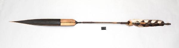 Freccia con punta e asta in canna. La penna è di colore chiaro con striature marrone scuro. L'estremità dell'asta più vicina alla penna è decorata con motivi pirografati.La decorazione è composta da sei fasce, divise in tre gruppi da due. La punta é tinta di nero con il curaro sul retro, mentre il davanti presenta il veleno con un motivo a spina di pesce.