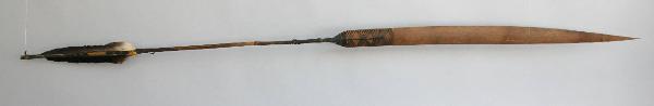 Freccia con punta e asta in canna. La penna è di colore nero con la parte finale bianca. L'estremità dell'asta più vicina alla penna è decorata con motivi pirografati. La decorazione è composta da otto fasce. La punta é tinta di nero con il curaro sul retro, mentre il davanti presenta il veleno con un motivo a x.