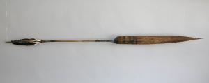 Freccia con punta e asta in canna. La penna è di colore nero con la parte finale bianca. L'estremità dell'asta più vicina alla penna è decorata con motivi pirografati. La decorazione è composta da cinque fasce. La punta é tinta di nero con il curaro sul retro, mentre il davanti presenta il veleno con un motivo geometrico con linee orizzontali e triangoli.