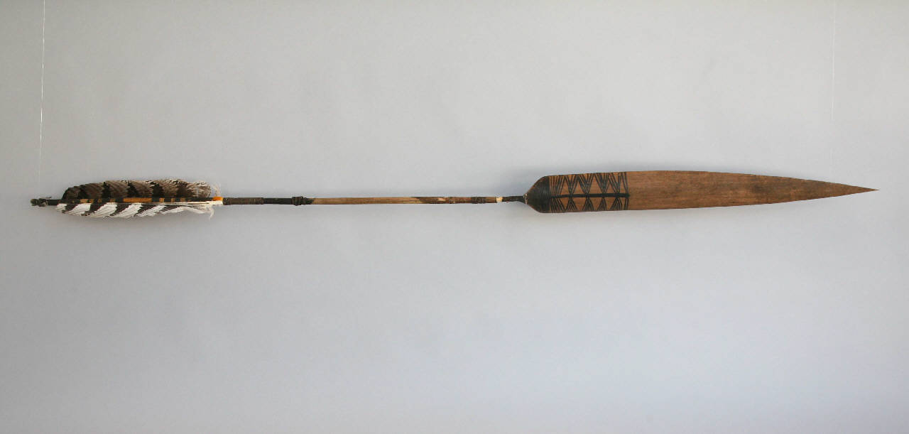 Freccia con punta e asta in canna. La penna è di colore bianco con striature scure. L'estremità dell'asta più vicina alla penna è decorata con motivi pirografati. La decorazione è composta da nove fasce, divise in gruppi di tre, quelle del gruppo più in alto sono più larghe. La punta é tinta di nero con il curaro sul retro, mentre il davanti presenta il veleno con un motivo a x.