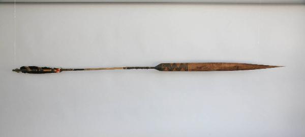 Freccia con punta e asta in canna. La penna è di colore bianco con striature scure. L'estremità dell'asta più vicina alla penna è decorata con motivi pirografati. La decorazione è composta da cinque fasce, divise in un gruppo di due e uno di tre, quelle del gruppo di due sono più larghe. La punta é tinta di nero con il curaro sul retro, mentre il davanti presenta il veleno con un motivo a spina di pesce.